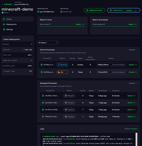 It’s our foundational goal to make Hathora as easy as possible to integrate with the existing tech stacks. On that front, we’ve invested heavily in a simple UI to deploy and test your games on our platform with Hathora Console (and CLI support if that’s your thing). You can view logs, track metrics, and update deployment configurations with 0 downtime.