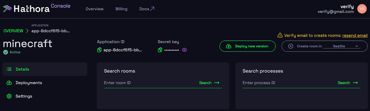 Yes… you should check your spam 📂. We made email verification required for accounts that weren't created using social logins for increased security. The create room button will be grayed out until verification is complete. If you’re still having issues, reach out to contact@hathora.dev and we will be happy to assist!
