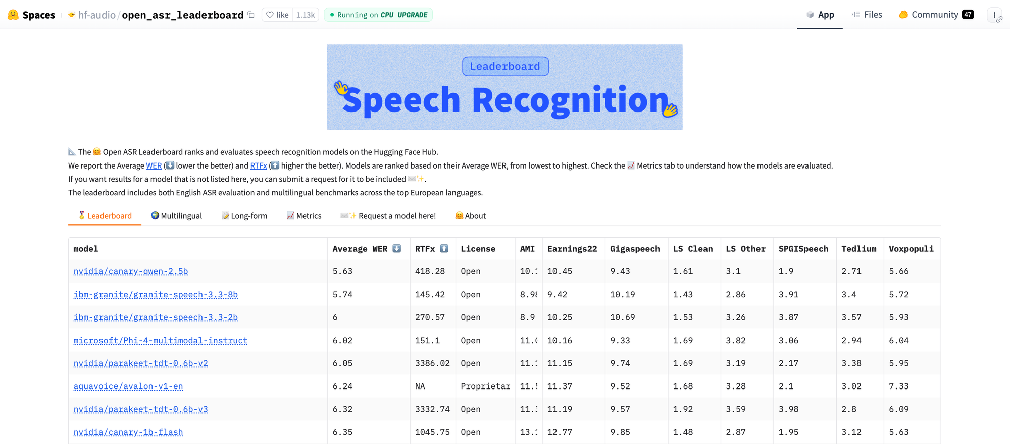 In speech recognition, open ASR models are leading the leaderboards with multiple NVIDIA and IBM models occupying the top 5 rankings. The highest-ranked proprietary service sits down at sixth place.