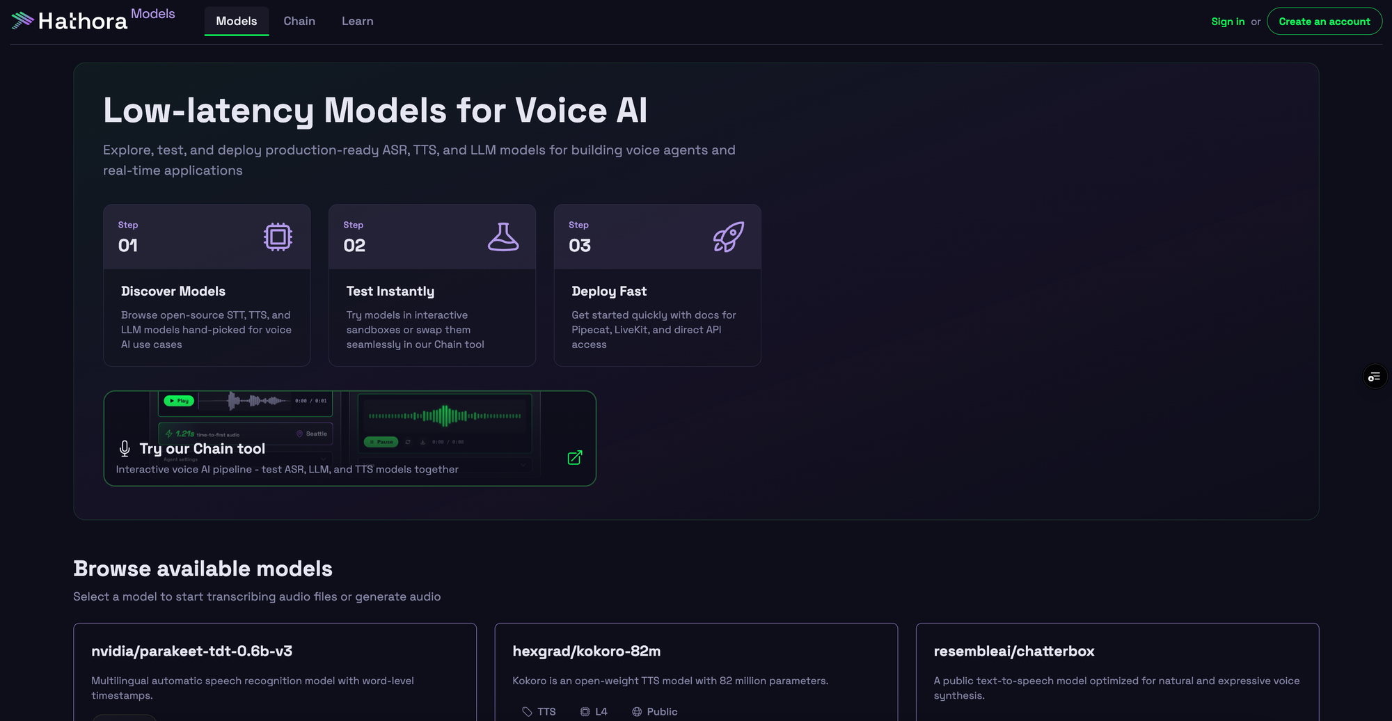 Today is an exciting day in Hathora's journey. I’m thrilled to announce the launch of models.hathora.dev, an inference platform to explore, test, and deploy production-ready ASR, TTS, and LLM models for voice agents. You can try it today and support our launch on Product Hunt.