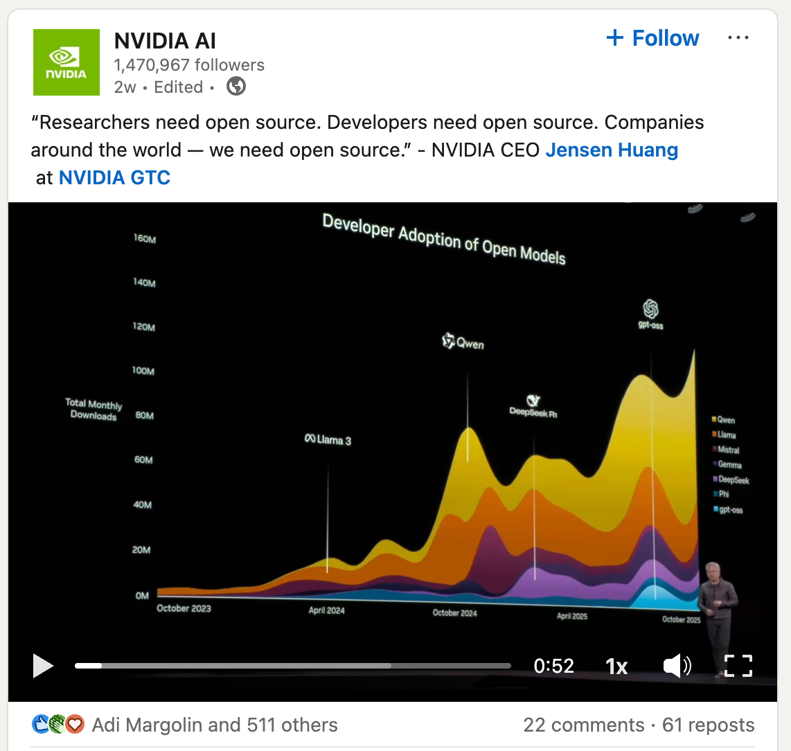 Large players in the space have been speaking about how open source is the future. For example, NVIDIA’s CEO Jensen Huang has praised open-source AI for “fueling the adoption of AI in enterprises” by allowing companies to build without being gatekept by closed API providers.