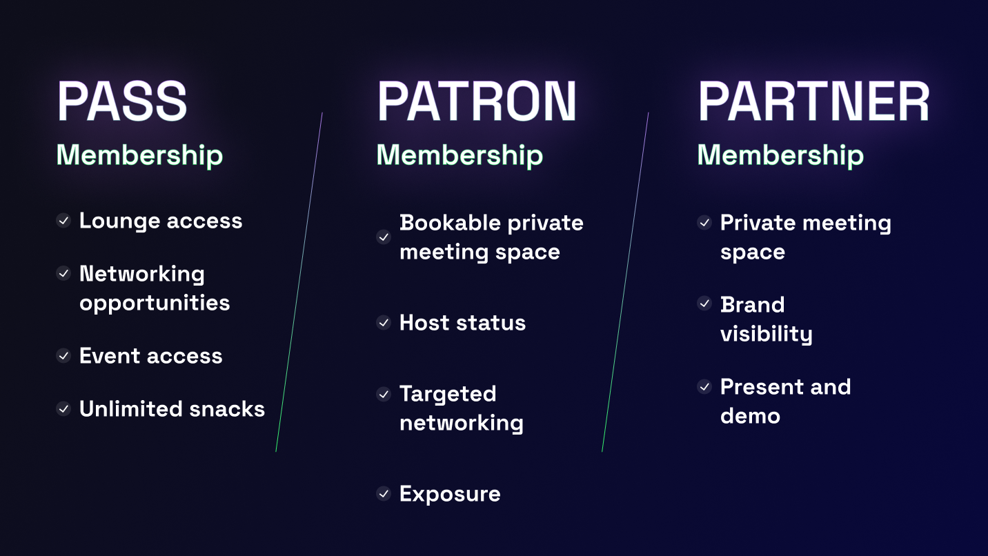 A private lounge space designed for backend engineers, CTOs, and studio heads to meet, work, and network. Hub members get access to: