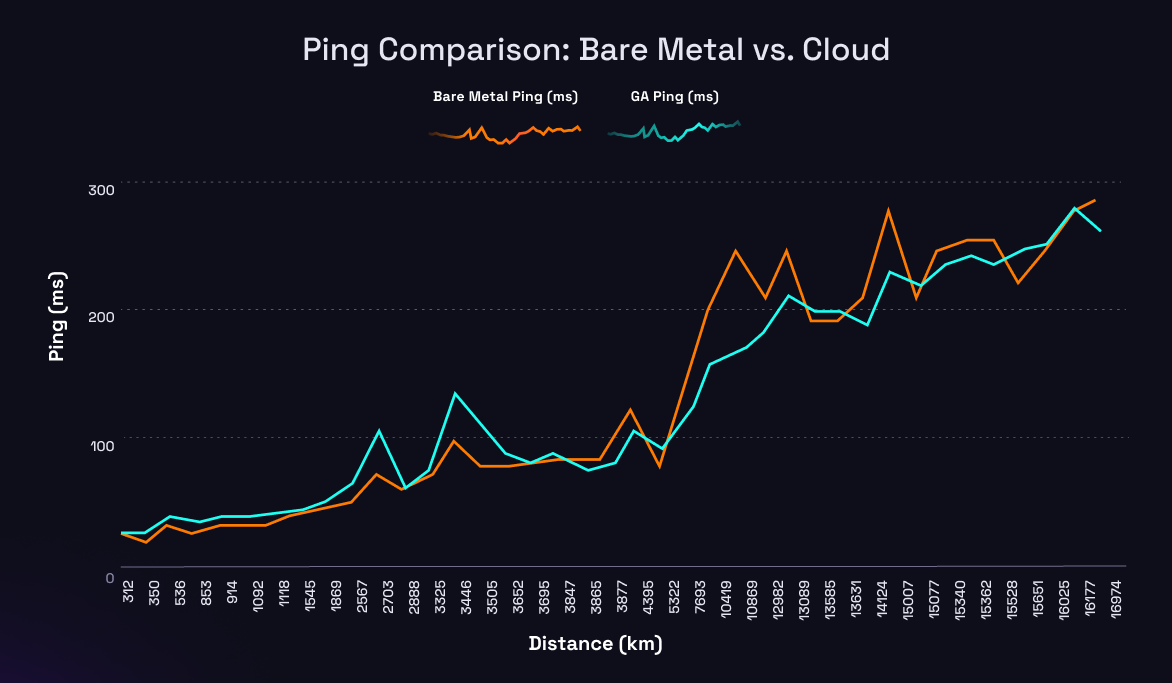 On the compute side, we evaluated Intel and AMD processors, and found that high density AMD chips (especially the recently released 4th generation ones) were more than capable of powering modern Unreal and Unity based game servers, while also being highly affordable. We already had experience benchmarking network performance from our Cloud Latency Shootout, so we benchmarked the vendors' edge network against the winning premium cloud network (AWS Global Accelerator). For the best performing vendor, we saw it outperform Global Accelerator within distances under 4000km (the distance between New York and San Fransisco). Ultimately, our top providers were chosen based on their regional data center availability (they had to operate in at least the 11 regions that we already offered on our platform), hardware availability for our desired server specs, and edge network performance.