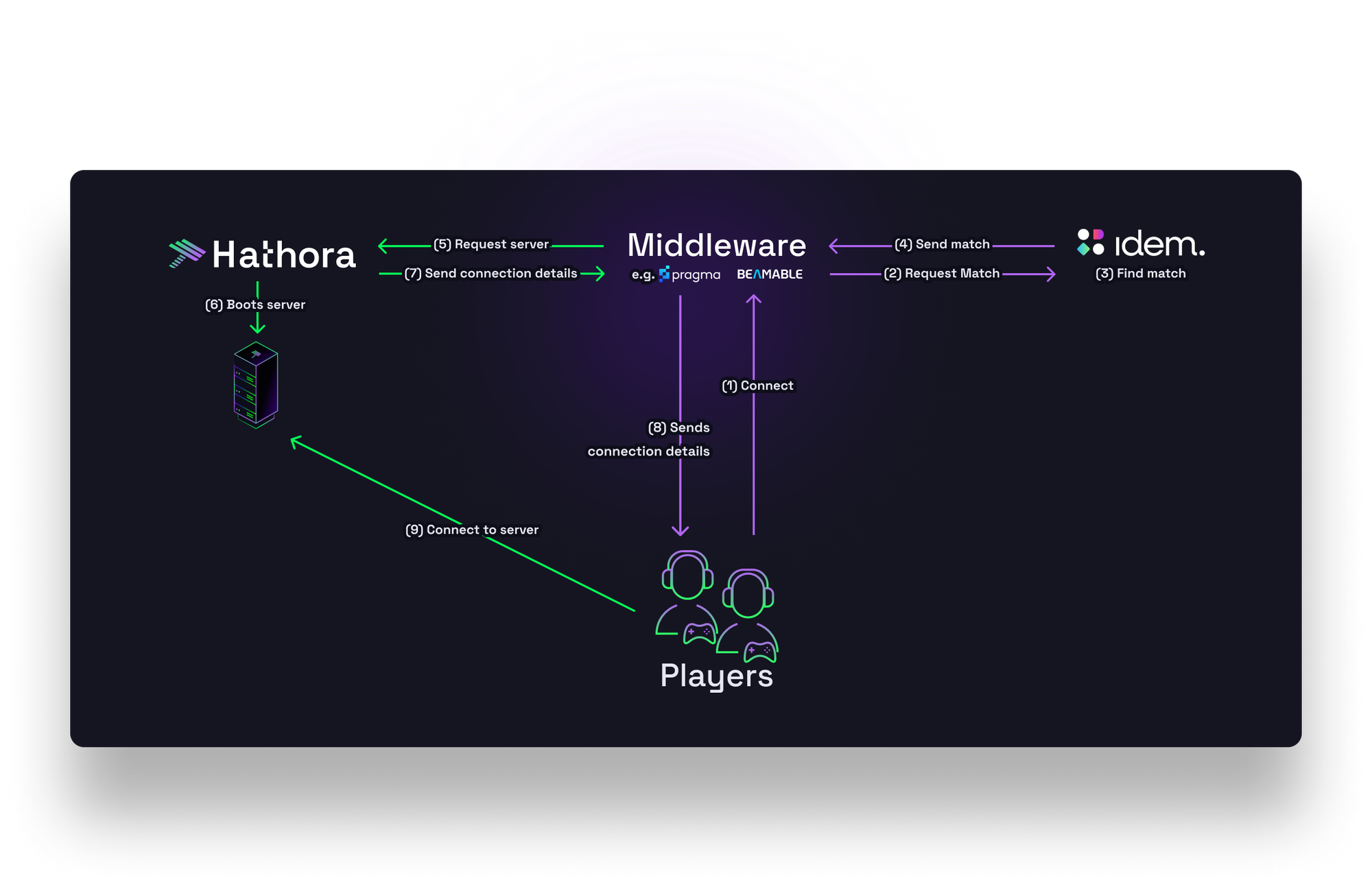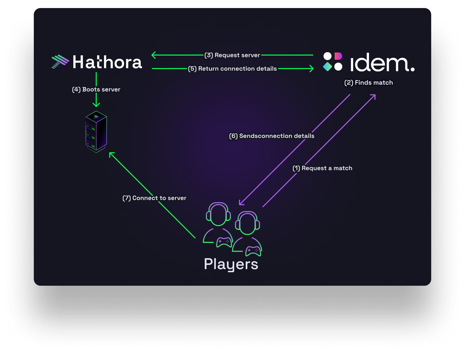 With the launch of Idem and their simple integration with Hathora, you can get a functional matchmaker integrated into your game and launch processes on Hathora super efficiently. Now let me illustrate how they come together.
