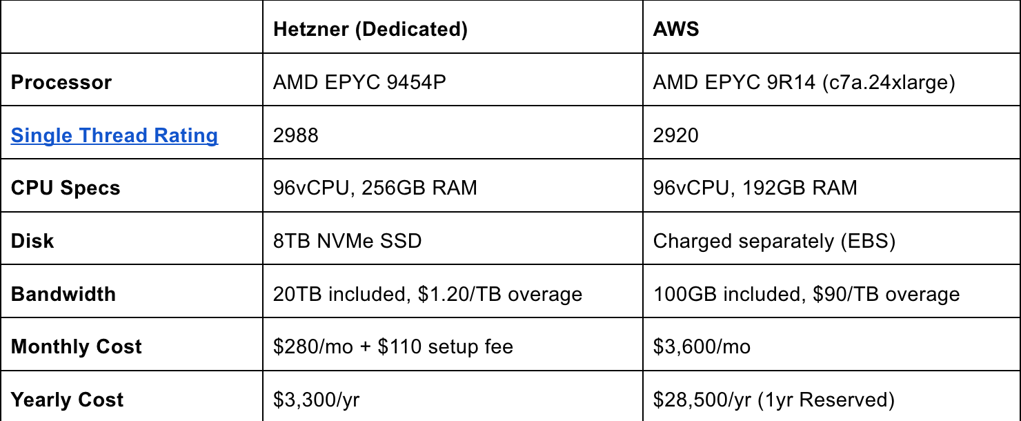 The caveat is that Hetzner Dedicated requires a minimum of 1 month reservation, whereas AWS is able to bill on-demand on a per-second basis. Despite this, it’s remarkable to see that the price to rent an equivalent Hetzner server for a whole year is cheaper than what you’d pay AWS for a single month.